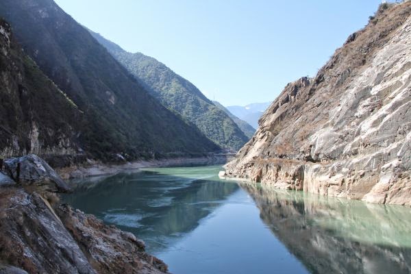 左邊係香格里拉哈巴雪山,右邊係麗江玉龍雪山,兩座五千幾米高既高山之間小小既峽谷就係虎跳峽,當時導遊話虎跳峽係世界最深既幾個峽谷之一,同美國大峽谷呢啲峽谷齊名:事實係點就冇去考究,不過我知道虎跳峽計算高度係由最高既玉龍雪山山頂計起,而唔係計算而家可見既峽谷高度,所以除左坐飛機之外係好難見到虎跳峽有三千米落差